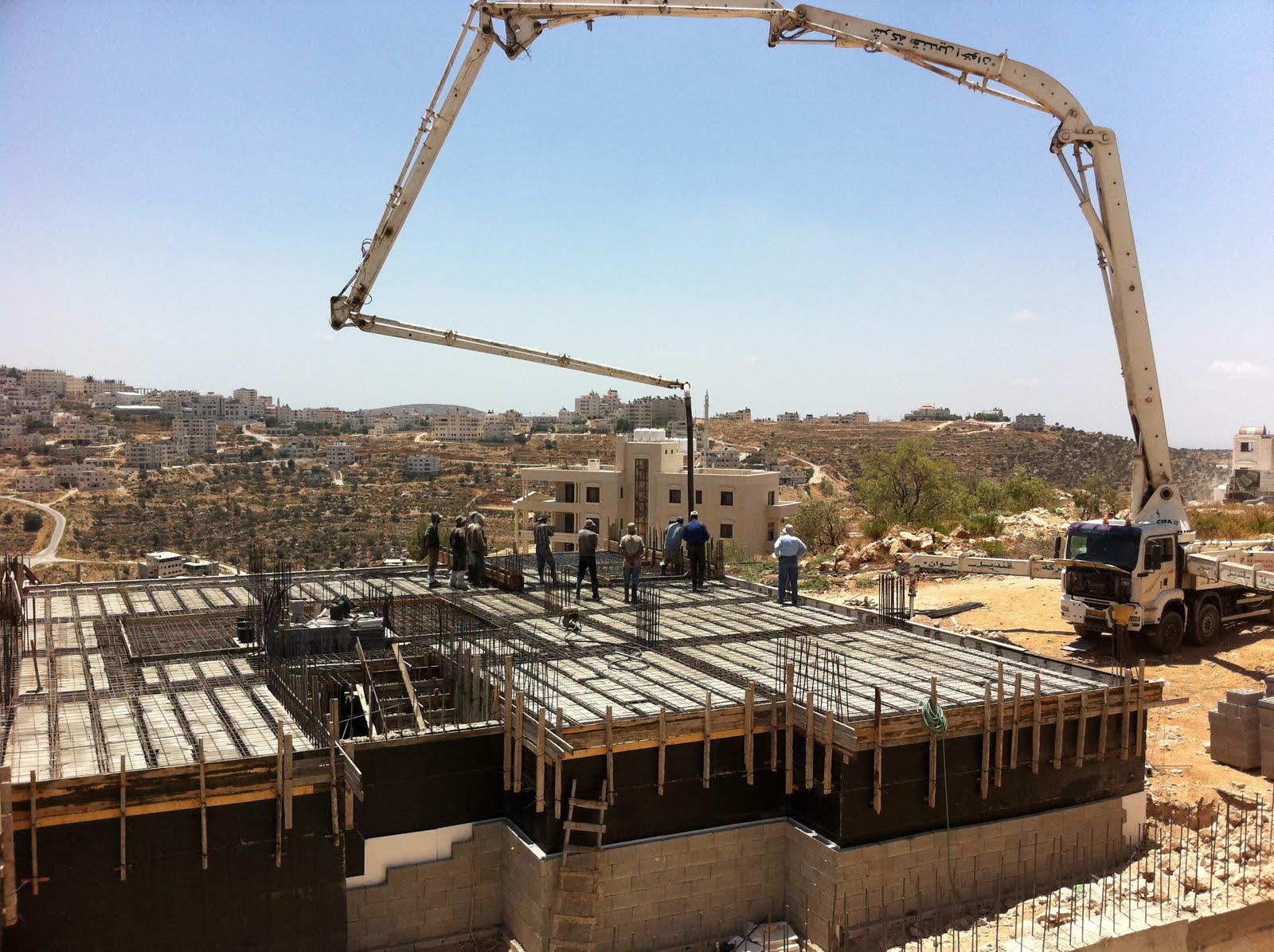 Below you can see photos of the exterior walls and columns after the first phase of pouring, as well as what the building looks like today, with all the exterior walls completed and the forms for the 'Aqdeh beginning to cover the floor surface.